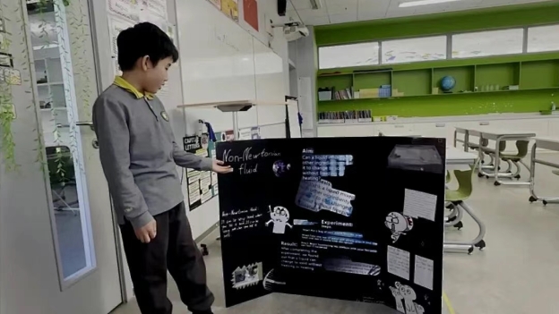 这是我们小组的科学展项目——非牛顿流体。它是一种很特别的液体:当你轻轻碰它时,它会像水一样流动;但当你用力敲打时,它却会变硬,好像固体一样。