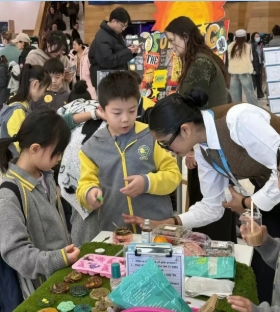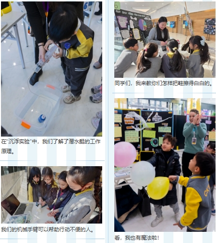 在孩子们的巧思与投入下,各年级展区被打造成一个个充满想象力的探索空间——色彩丰富的展板、互动装置、展示创作原理的PPT、游戏奖品……